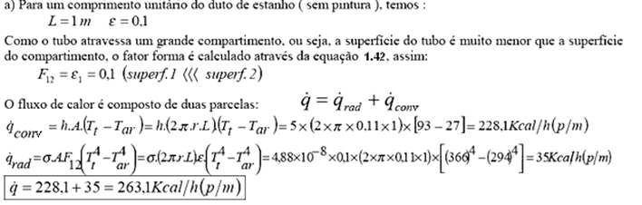 Exercício R.6.5.1. Um duto de ar quente, com diâmetro externo de 22 cm e temperatura superficial de 93 ºC, está localizado num grande compartimento cujas paredes estão a 21ºC. O ar no compartimento está a 27ºC e o coeficiente de película é 5 kcal/h.m2.ºC. Determinar a quantidade de calor transferida por unidade de tempo, por metro de tubo, se: